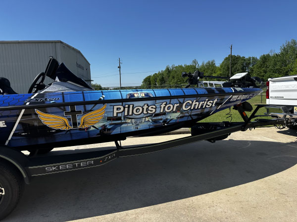 Monroeville, Ala. (April 24, 2025) – Twenty-four years ago, Pilots for Christ provided hope and support to David Landis and his family by flying their two-year-old daughter to Miami Children’s Hospital for critical neurological testing. Inspired by this life-changing experience, Landis and his team at Landis Design Company recently completed a custom-designed boat wrap featuring sponsor logos and prominently showcasing the Pilots for Christ logo on a boat owned by local supporter Brad Trotter.