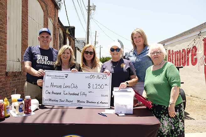 The Atmore Lions Club has been going through some funding issues recently, and when the Chamber of Commerce discovered the problem, they planned and set up a Conecuh sausage dog sale Friday, May 16. The sausage was donated from Conecuh Sausage and the Chamber provided buns and condiments. Lions workers cooked the sausage and managed sales. Modern Woodmen of America matched Lions sales of $1,250. Shown are, from left, Bub Gideons, Pam Pritchett with Modern Woodmen, Jennifer White, Joyce Petty, Sara Smith and Nancy Karrick.