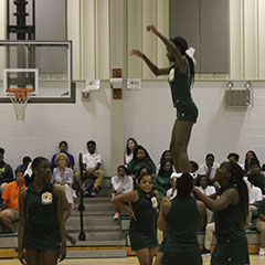Escambia County Middle School students and faculty held their first pep rally for the 2017-2018 school year. The students cheered on the ECMS football team and ECMS volleyball team. Shown above, ECMS cheerleaders perform a stunt; Below, Ms. Wasdin and Ms. Hybart participate in the fifth grade relay competition. .