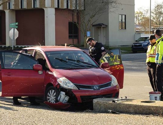 Atmore police and fire personnel examine a 2009 Nissan Versa that witnesses said ran the stop sign at the junction of Pensacola and East Nashville avenues around 8:38 a.m., Monday, March 14. The car collided with a concrete barrier on the northern side of Nashville, causing major damage to its front end. Police reports show that the driver had twice the legal limit of alcohol in her blood and was…